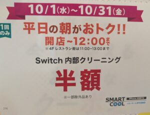 兵庫県伊丹市でのiPhone修理・iPad修理はスマートクール イオンモール伊丹昆陽店へ イオンモール伊丹昆陽店 072-744-006110:00~21:00 メニュー 電話 ネット予約 ホーム 修理一覧 修理の流れ FAQ 店舗概要 コラム お問い合わせ イオンモール伊丹昆陽店 イオンモール伊丹昆陽店ホーム修理一覧修理の流れFAQ店舗概要コラム お問い合わせ実績リアルタイム速報ホーム > 最新のお知らせ > キャンペーン > イオンモールアプリクーポン☆平日午前限定 Switch内部クリーニング半額☆イオンモールアプリクーポン☆平日午前限定 Switch内部クリーニング半額☆イオンモール伊丹昆陽店キャンペーン 期間限定クーポン配信中!10/1(水)~10/31(金)☆Switch内部クリーニング半額☆二年以上使用されている方は、この機会に是非ご利用ください!内部のホコリや汚れが端末の故障に繋がってしまいますので、お気軽にご相談ください!